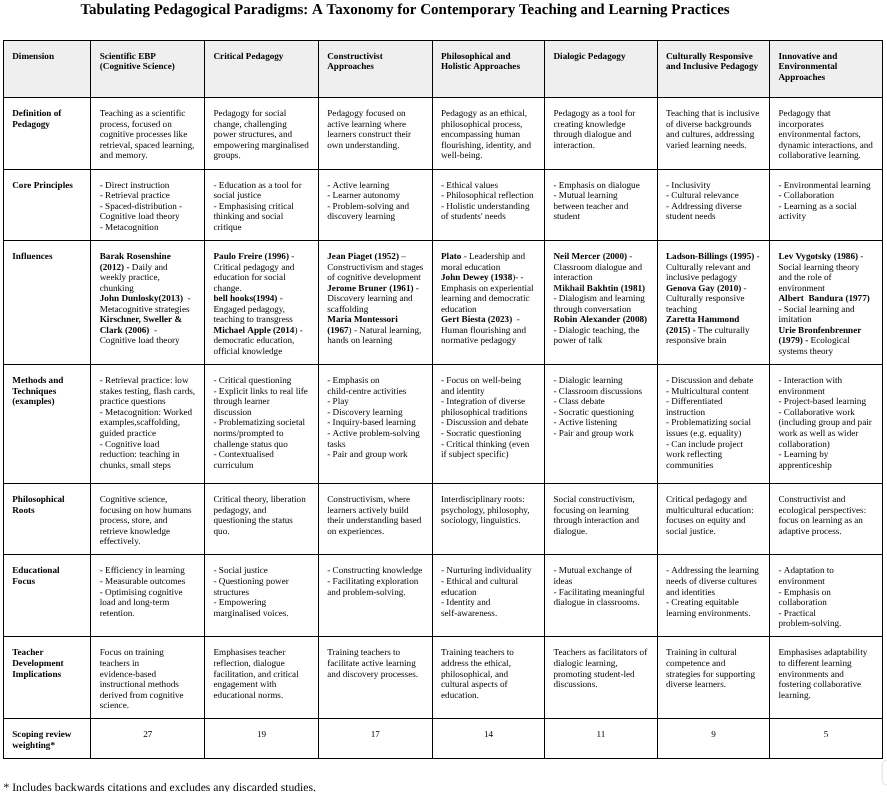 The taxonomy was constructed through a scoping review – a method used to map the breadth of existing research without assessing its quality (Levac et al., 2010). This involved querying educational databases using keywords like ‘pedagogy,’ ‘teaching styles’ and ‘evidence-based practice,’ followed by categorising studies into shared paradigms. The findings were then tabulated based on their theoretical principles, instructional methods and implications for teacher development.